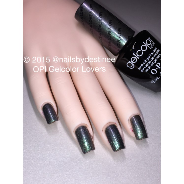 This was one of the first duochrome type colors that OPI released in GelColor!! Its so pretty it has a grey base then a purple/green transition with shimmer. I think i was able to get both of the colors in this picture.