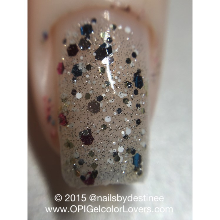 This is a clear base with silver and white small circle glitter with multi-colored small and large hexagon glitter