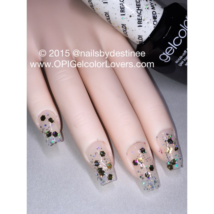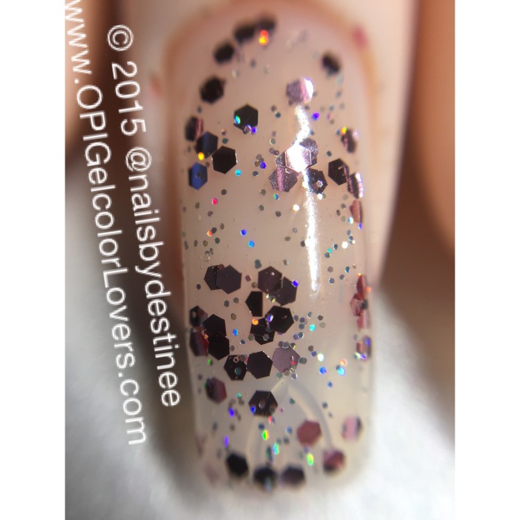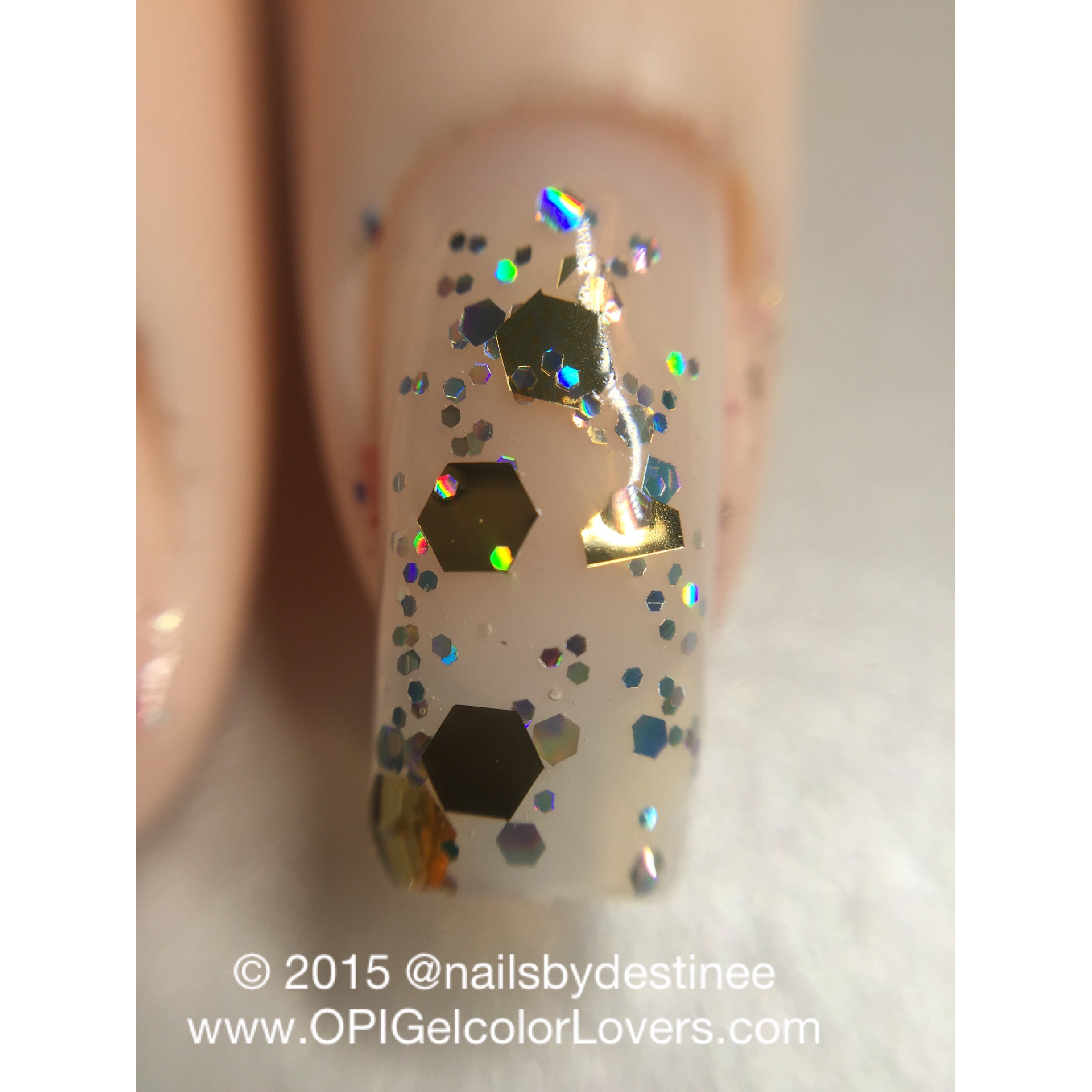 This is a clear base with large hexagon gold glitter, medium hologrpahic hexagon and small holographic glitter. This is very similar to When Monkeys Fly (Oz Collection), but this one it way easier to get the glitter out.