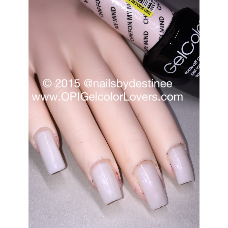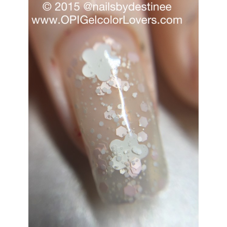 This is light pink and white glitter in clear base. There are small & medium hexagons and flower shapped glitter. You need to fish for the flowers and be prepared to double or triple top coat because the flowers dont lay flat so an edge can pop out.