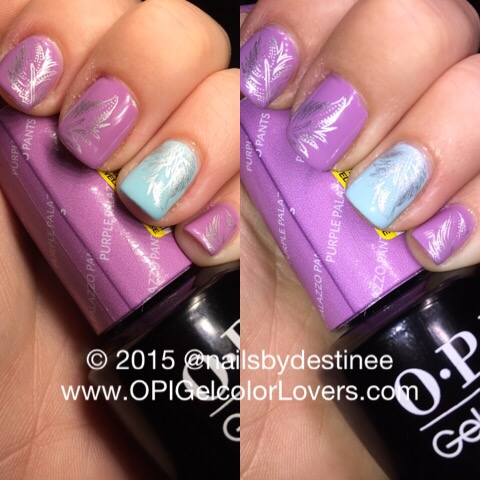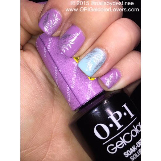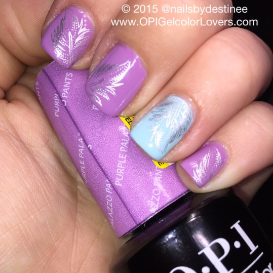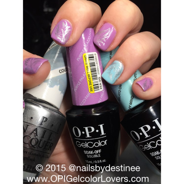 Today I decided to use from the Venice Collection Purple Plazzo Pants and Gelato On My Mind. These formulas are AMAZING!! They go on so perfectly smooth and with no issues. It’s great. They were opaque in two coats, but i did do 3 coats for good measure. These two colors are such a perfect combination for spring or summer. My Fiance said they look very Easter like…. especially with the stamped feather. Eh either way I love how it turned out. BTW Ignore the dry cuticles… Its been a long week at work…