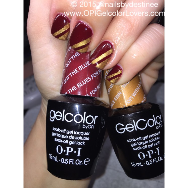 I used Got the Blues For Red (Femme Fatals Collection). Its abeautiful burgandy almost Ox Blood Color. No Application issues it applied beautifully. I used straight line nail vinyls and applied OPI With A nice Finn-ish, flash cured and pulled the vinyls off then full cured and filled in the color with a smaller brush. Was actually very easy to do and very Fall-ish.