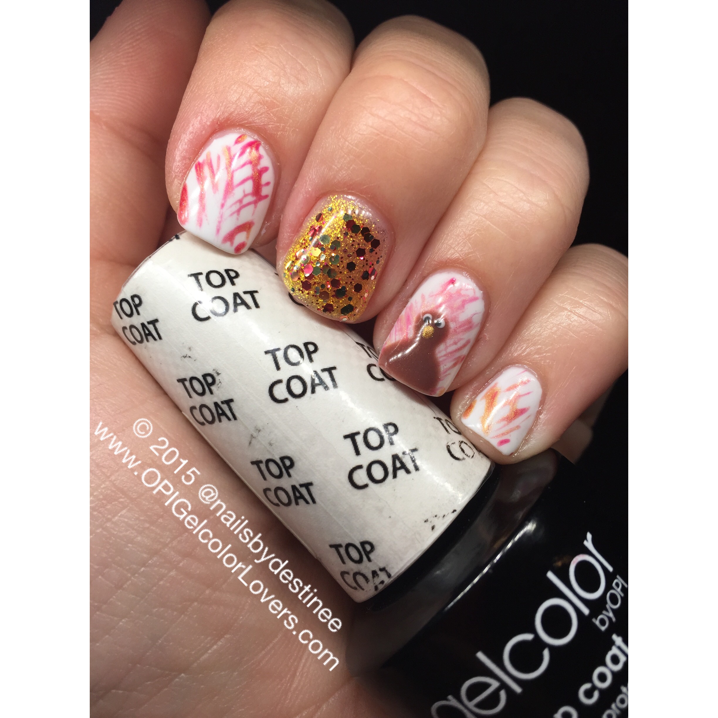 I used a fan brush with Dutch tulips & OPI with a nice finn-ish on an alpine snow base on my thimb, index, ring ( as the feathers!) and pinky.