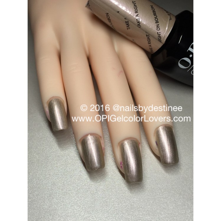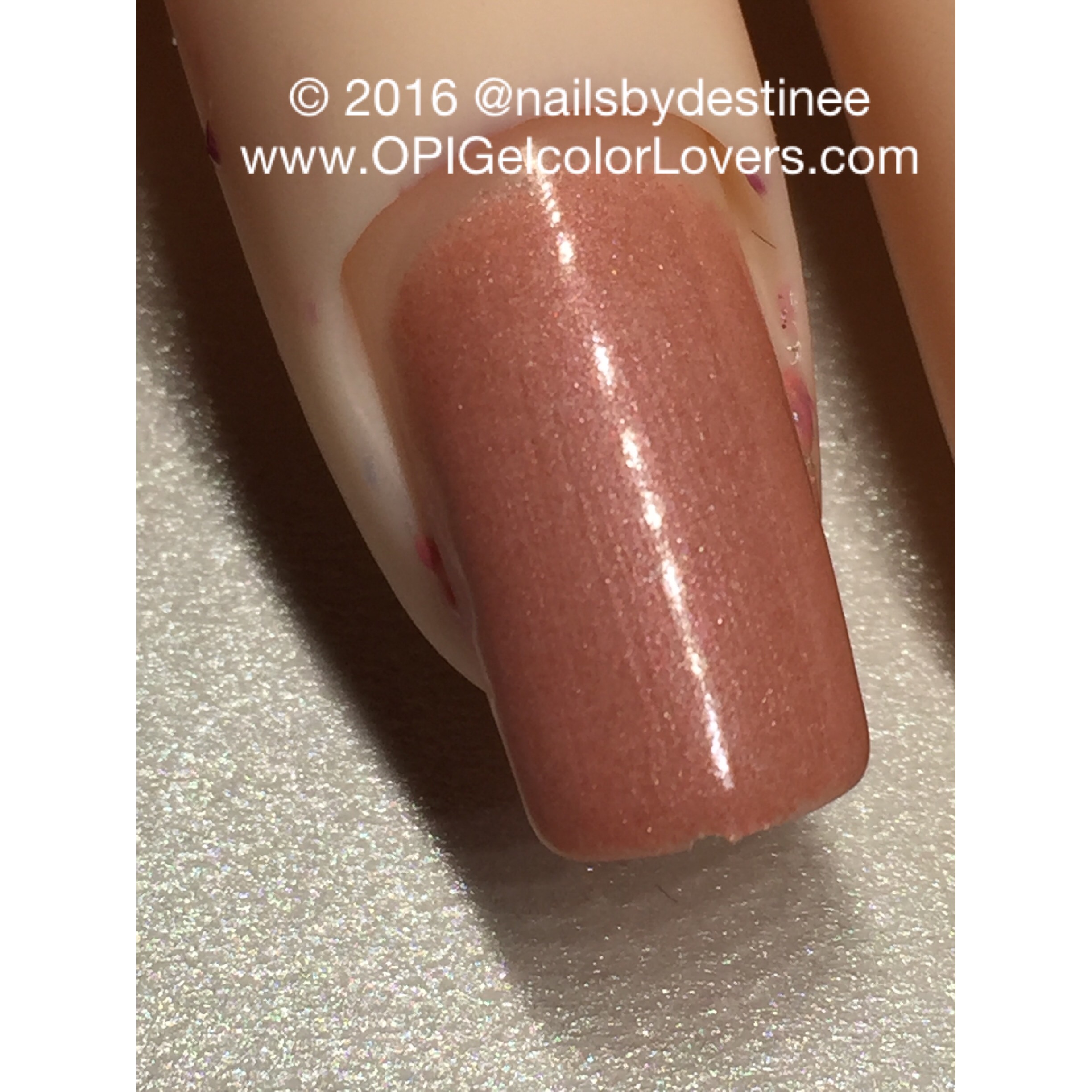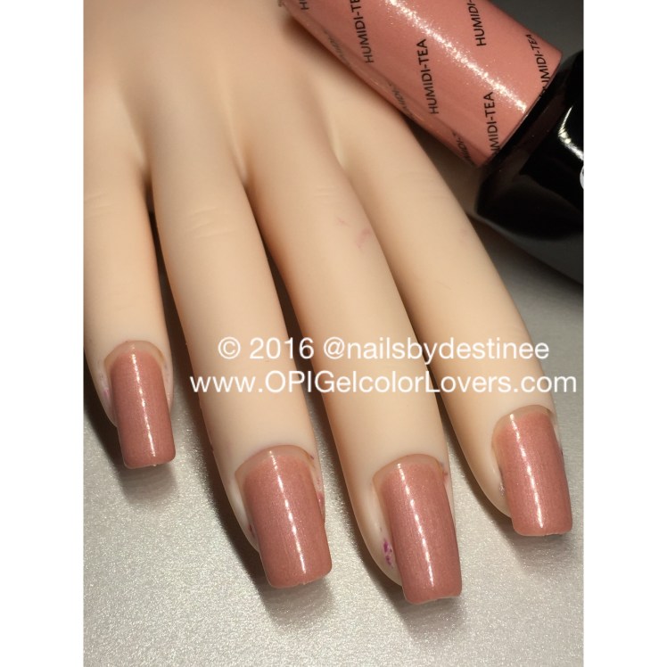 I really like this color! It reminds me of Gouda Gouda Two Shoes which was never made in gel sadly. This is a nude base with hints of gold and tan shimmer. It’s really beautiful and a great color or nude nails and you still get some sparkle.