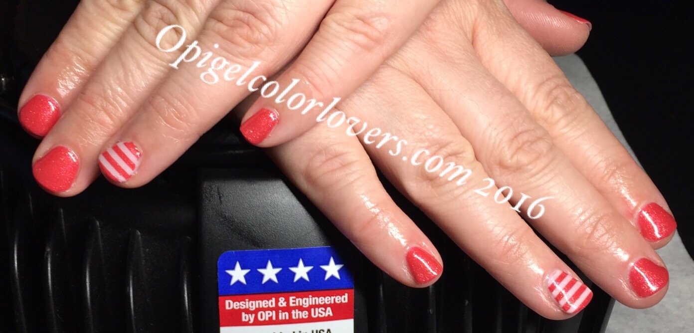 So the main color is Go With The Lava Flow (Hawaii Collection) its such a pretty fun color! Its very sparkly (I know the picture doesnt do it justice) and for the strips I used Chiffon My Mind (Soft Shades 2015). I used straight line nail vinyls to make the lines from TwinkledT.