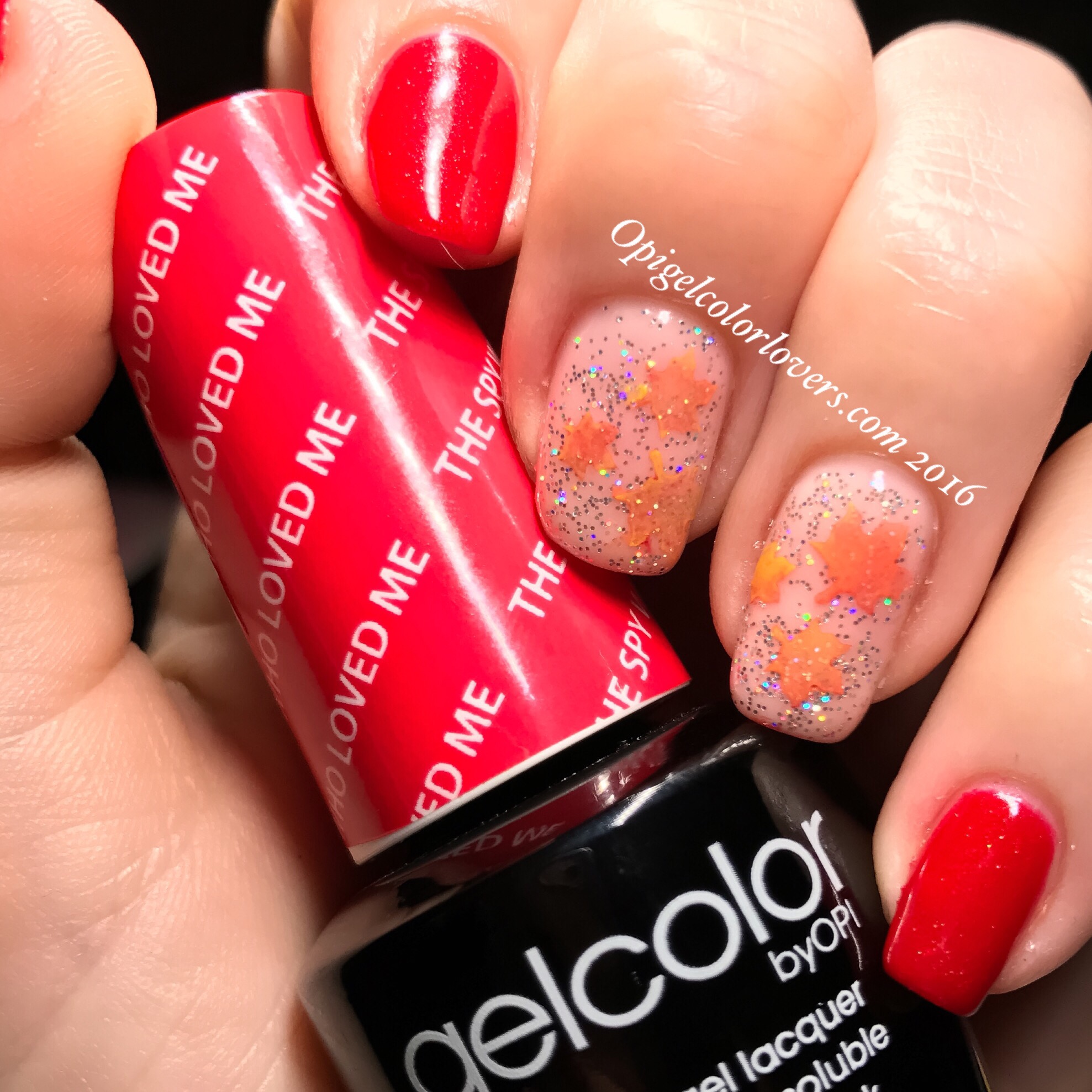 So anyways on to the colors! The red is The Spy Who Loved Me (Skyfall) it’s a beautiful creme red with red and gold glitter in the polish! I only used two coats but now I’m wishing I used three to get a richer red but as you see it does work with two coats. My other two fingers have Bubble Bath (pink version Romantics ) two coats also… who doesn’t love this color!! It’s perfect for almost anything! I did out one coat of Champange For Breakfast (Tiffany) just to add some sparkle behind those leaves!