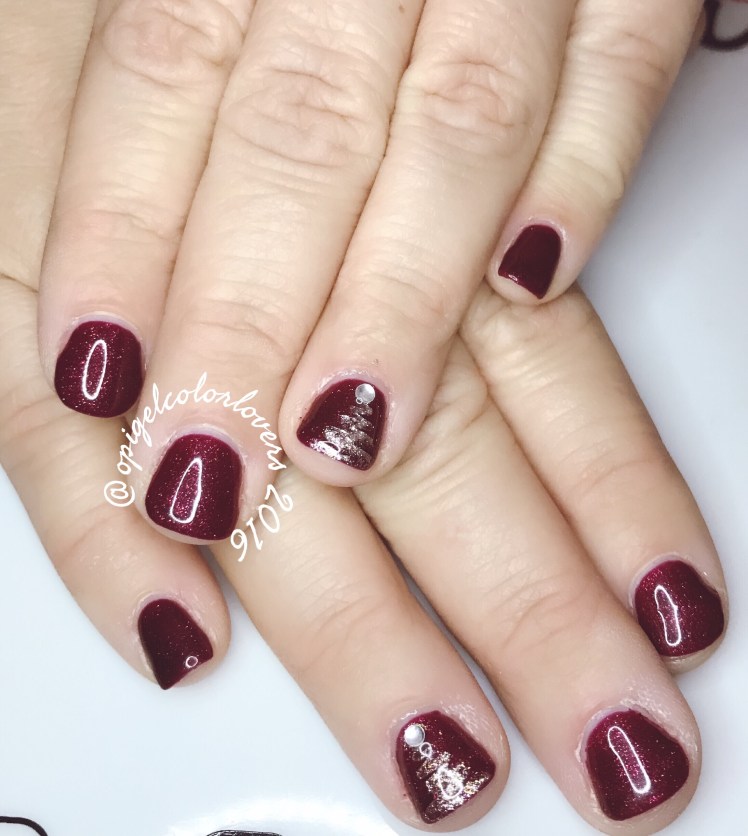 Anyways today I have Let your love shine (Starlight) which is a beautiful dark red sparkle polish. I used only 2 coats and its perfect. The application is amazing and you don’t need to fight to make it look awesome either which is always a plus for me. I used a tree decal from TwinkledT (see below link), I used a part of a makeup sponge and sponged on Five -And-Ten (Tiffany’s) flash cured and pulled it off then full cure. I also added a stone at the top, it seems everyone has different methods of applying them but here is mine: I use a dot of either the color or the clear top coat then put the gem down then cure it and when i top coat I don’t go over the top of it I go around it and I also do double top coat it.