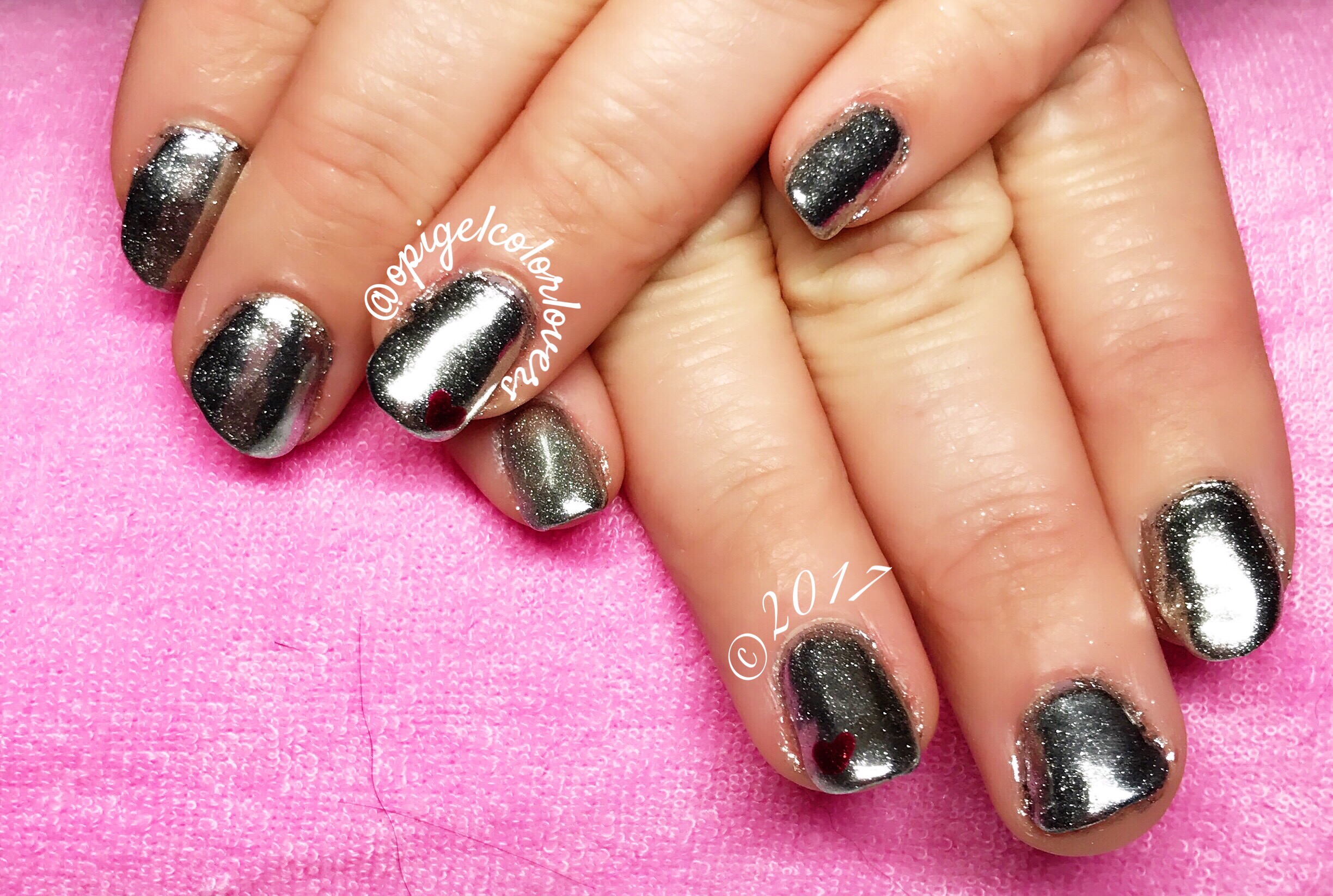 I got from Chrome powder from TwinkledT it’s called House of Mirrors.. I use a silicone brush and I scrub a layer into the tacky layer of my black polish (two coats), then I top the chrome with a no wipe top coat and cure, then top with another layer of the chrome then the no wipe top coat! and your done! Since this was around Valentines day we added some little hearts on her nail too with a tiny dotting tool using Let Your Love Shine (Starlight).
