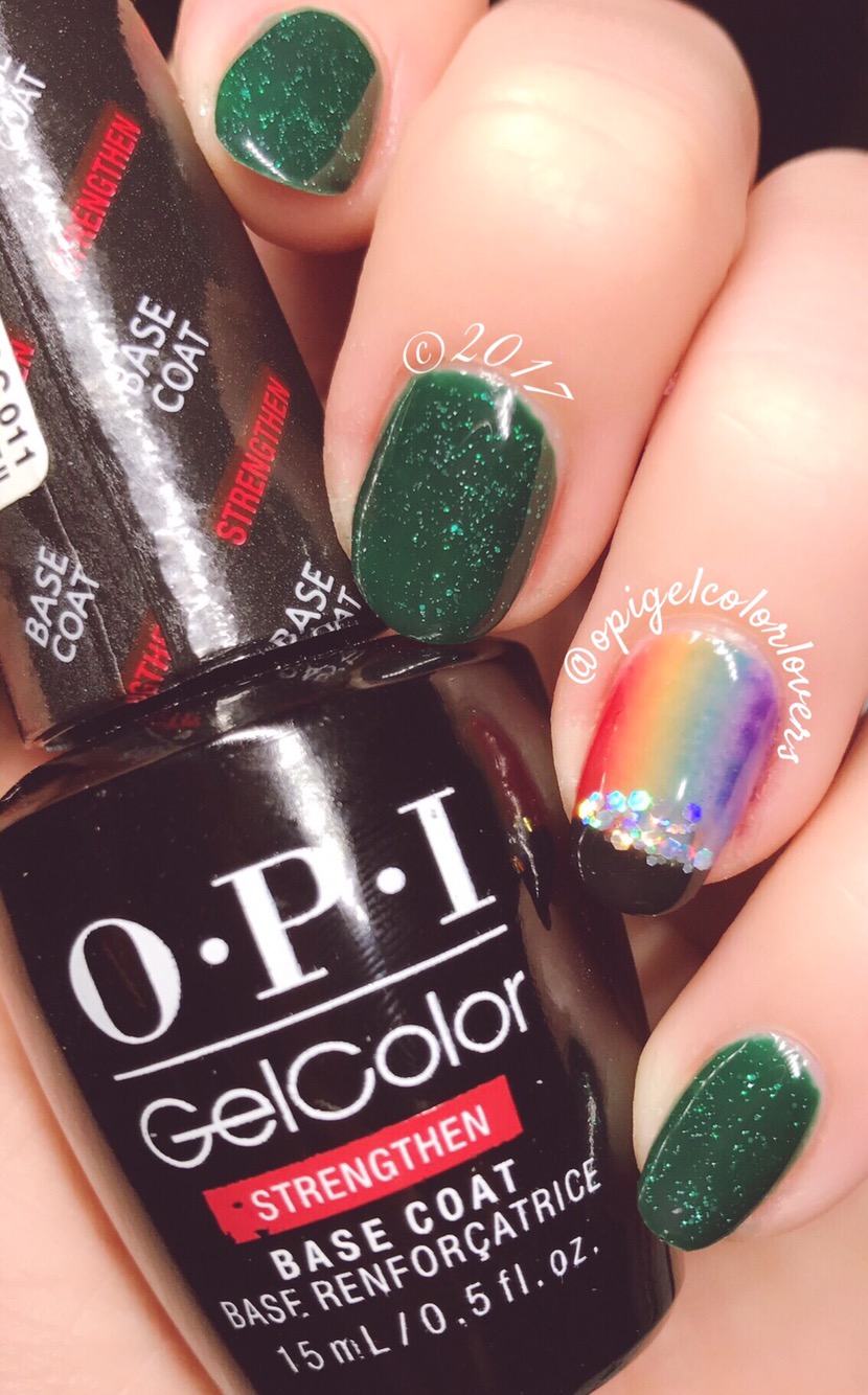 Happy St. Patricks Day!! So I did alittle green manicure to celebrate! I used a bunch of colors so lets go through them….Christmas Gone Plaid (Gwen Stefani Holiday) with a gelish green glitter topper – I only need two coats of the Christmas. It applies perfectly I probably could have done 3 coats to get better color (richer) but since I was going to put glitter over it I decided to jsut do two coats. For the rainbow I used a makup triangle sponge and just kept dabbing it over the nail… I should have used a white under it but I didnt. The colors in the rainbow are: Big Apple Red (Sirens), Can’t Afjord Not To (Nordic), I Just Can’t Copa Cabana (Brazil) , Christmas Gone Plaid (Gwen Stefani Holiday), Fearlessly Alice (Alice Through The Looking Glass), I Carol About You (Gwen Stefani Holiday). The black pot is Can’t Have Too Mani Friends!(Hello Kitty) with some I Reached My Gold! for the gold (Showgirls).