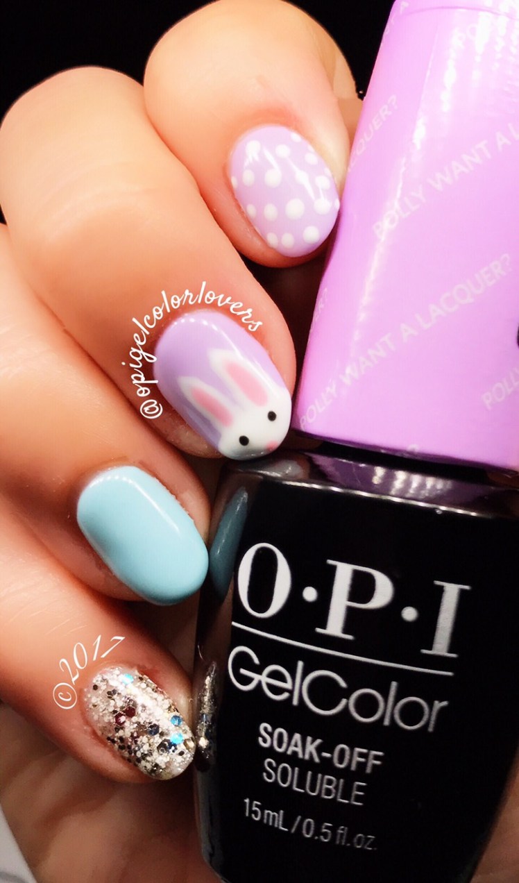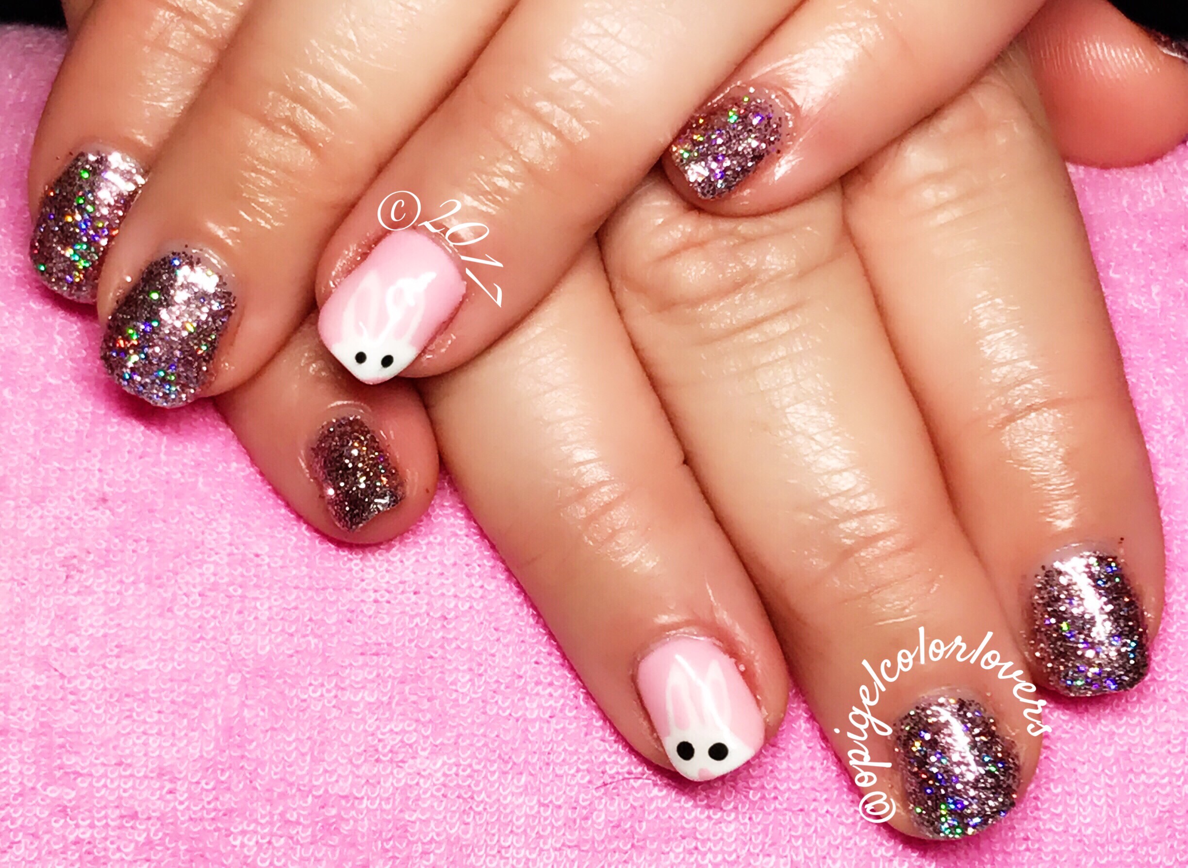 I’ve got bunnies galore for you! lol The first one has these colors: Suzi Without A Paddle (Fiji), What’s The Double Scoop? (Retro), Polly Want A Lacquer? (Fiji), and Muppets World Tour (Muppets Most Wanted). All of these were 3 coats, application was fine. I love these colors for spring. For the dots I used a small dotting tool, handpainted the bunny on the nail also. I did use artist series white for the bunny so it wouldn’t try to self level. for the glitter on the pinky I use a makeup sponge to get it thick enough on there – just make sure to use a skin barrier and clean up any of the edges prior to curing otherwise itll be stuck!