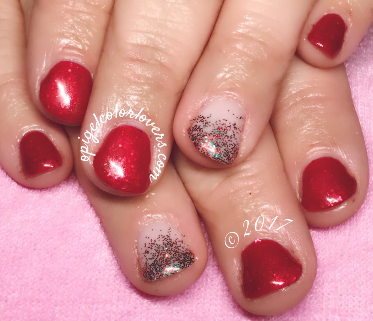 I started this by laying one coat of Red Hot Rio (Brazil) down then two coats of Fire Escape Rendezvous (Tiffany) which was perfect!! Then I put three coats of Love Is In The Bare (Soft Shades Matte) down and topped it with some red and green loose glitter. She wanted alittle glitter to celebrate the holiday and I thnk her combination celebrated the Holiday perfectly.