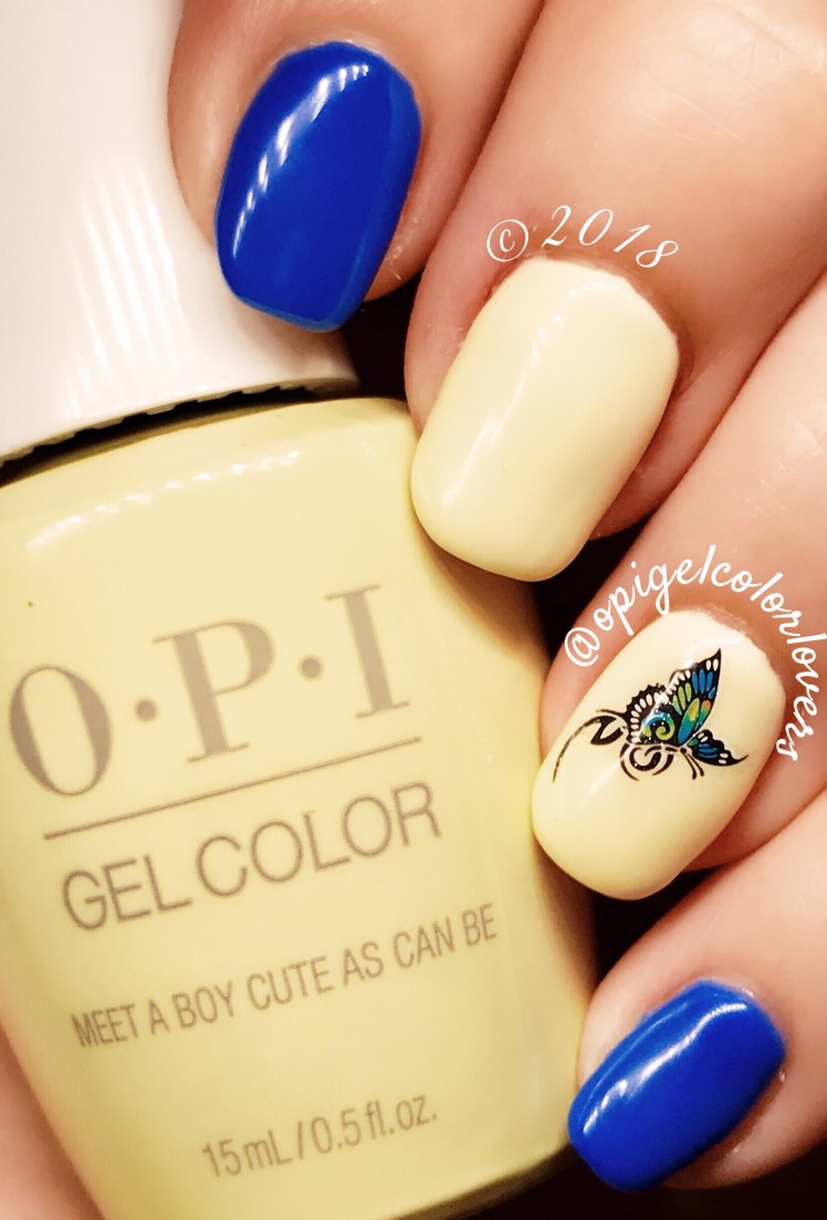 This manicure was a perfect mix of two colors that sometimes don’t always work together… The blue is Tile Art To Warm Your Heart (Lisbon) – seriously two coats and boom… done! The Yellow omg its so cute – Love Pastel yellows – Meet A Boy Cute As Can Be (Grease) this one, of course, needs three coats it’s a pastel I hope you weren’t expecting a two-coater! To top this all off I added a butterfly water decal! it was the perfect thing to tie these colors together.