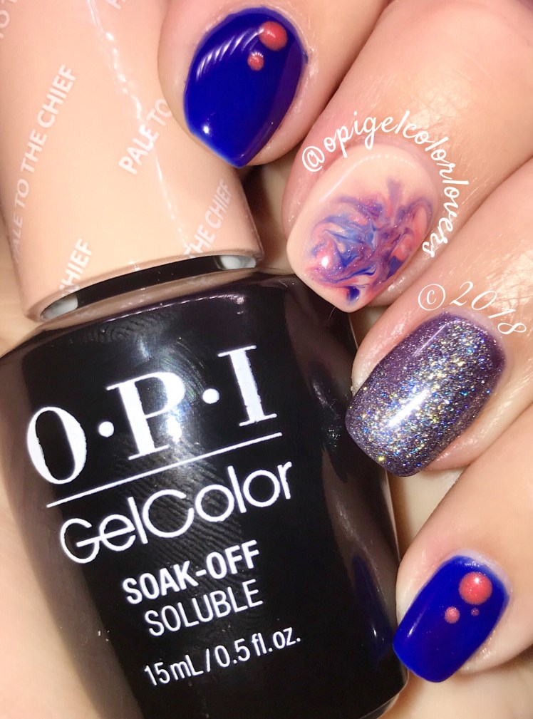 So I tried out some Blooming gel from The Gel Bottle it worked out actually pretty cool! Super easy to use too. I used Pale to the Chief (Washington D.C.) I used two coats – man pretty color that I must use more often. I used the blooming gel on this nail with dots of the other colors and then used the smallest dotting tool I had to swirl and make a design. The blue is My Car Has Navy-Gation (Brights) and the coral is I Mainly Eat Lobster (Thrillseekers). Lastly for the glitter nail an ever favorite On Her Majesty’s Secret Service (Skyfall), everyone loves this glitter is so said it was discontinued.