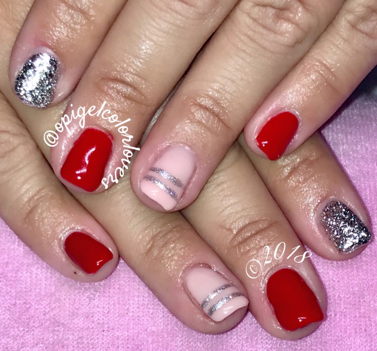 Okay here are some nails a little more with the Christmas spirit! Big Apple Red (Sirens) – What a classic two coats and BAM this red was ready to go out for the night! The nude nail is thegelbottle Builder in a Bottle #18 with a strip of My Signature is “DC” (Coca-Cola) then the silver glitter nail I used Vetro 271 silver leaf – this stuff is the bomb. like this is one coat; they come in a bottle or a pot.