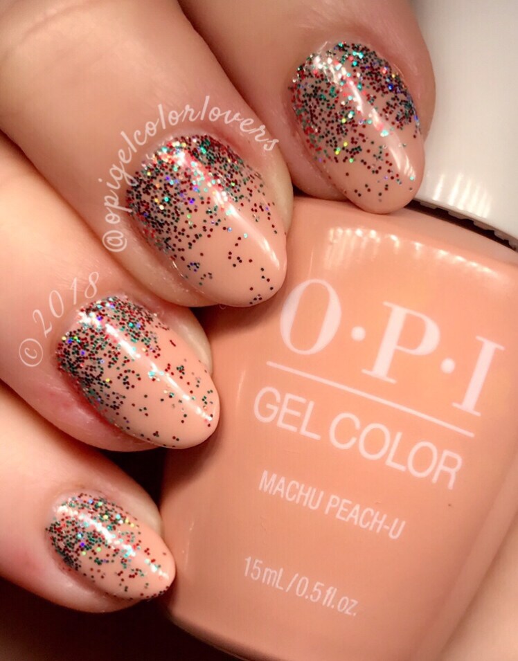 Okay so here’s a wonderful Christmas glitter manicure! First time I used Machu Peach-U (Peru). Wow this color is amazing! It does need three coats because it can get a little streaky. The glitter is a mixture of red, green and holographic loose glitter I just used a brush and dabbed the glitter into the inhibition layer and then patted it down with my finger.