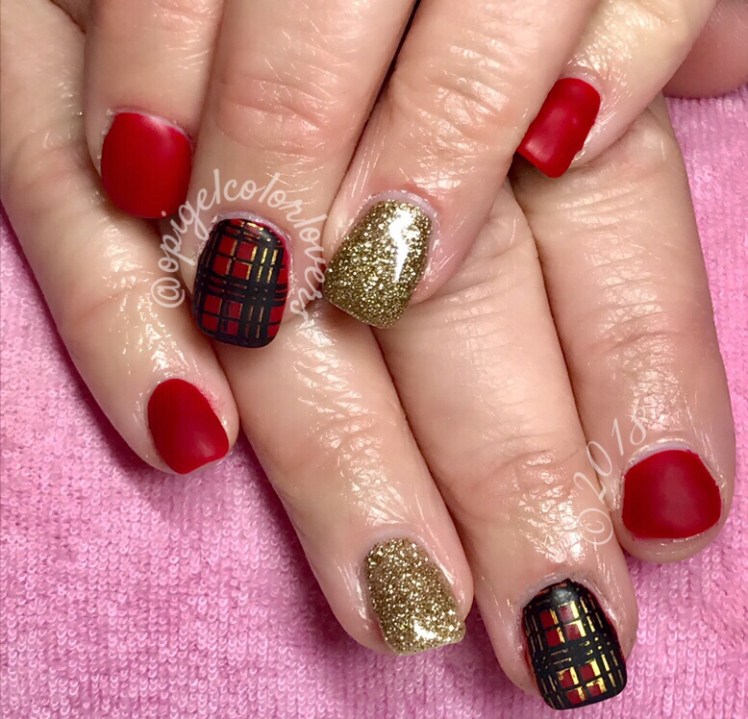 More holiday manicures! Okay so the gold sparkle is All Sparkly and Gold (Mariah Carey Holiday) this uses like four coats. The red color is Tell Me About It Stud (Grease); perfect red! I used three coats then put the gel bottle matte on top of all the nails except the glitter. Finally stamping using Born pretty stamping plate BP-L013 using Born pretty stamping Polish #1 & 3.