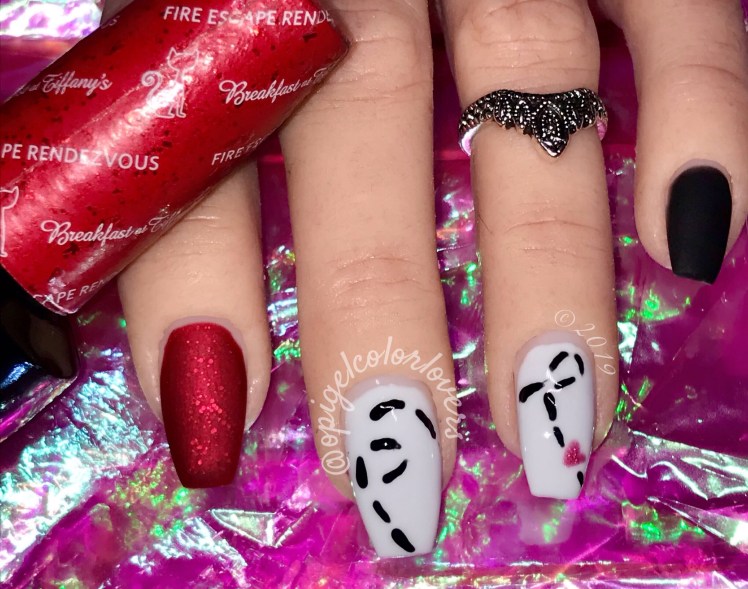 Almost Valentine’s Day! This year is going really fast… I saw a similar nail art on Pinterest and I tried it out – no its not perfect but it really cute. So the red is Fire Escape Rendezvous (Tiffany); this color is so cool! I love it and matte is even cooler! It’s a shimmering red with red flakes in it, very concentrated easily opaque in two coats. the white base is a favorite white of mine Suzi Chases Portu-Geese (Lisbon), awesome plain white (more manicure with it just search it). The pinky is My Gondola or Yours? (Venice) usually, this is a shimmery black but once it’s matte it’s so pretty; it does need three coats though. Finally, for the art I used Vetro 22 for the dashes and 347 for the heart. I had to use a pointed art tool to get the lines – which I know they aren’t perfect but it works!