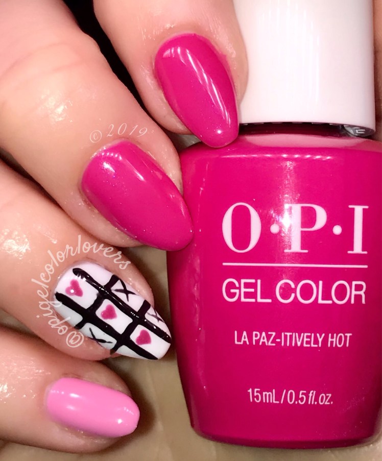Happy Valentine’s day!! I hope everyone is having an amazing day!!! I saw a similar nail art on Pintrest and decided to do it too for Valentines. I used LA Paz-Itively Hot (Iconic Release), wow this color is SO pretty! It’s a bright pink color with a faint purple-pink shimmer, it would have been perfect in two coats but I did use three coats. I used Suzi Chases Portu-Geese (Lisbon); then I used multiple Vetro color for the nail art. I used multiple nail art brushes to make the lines and used a dotting tool to make hearts.