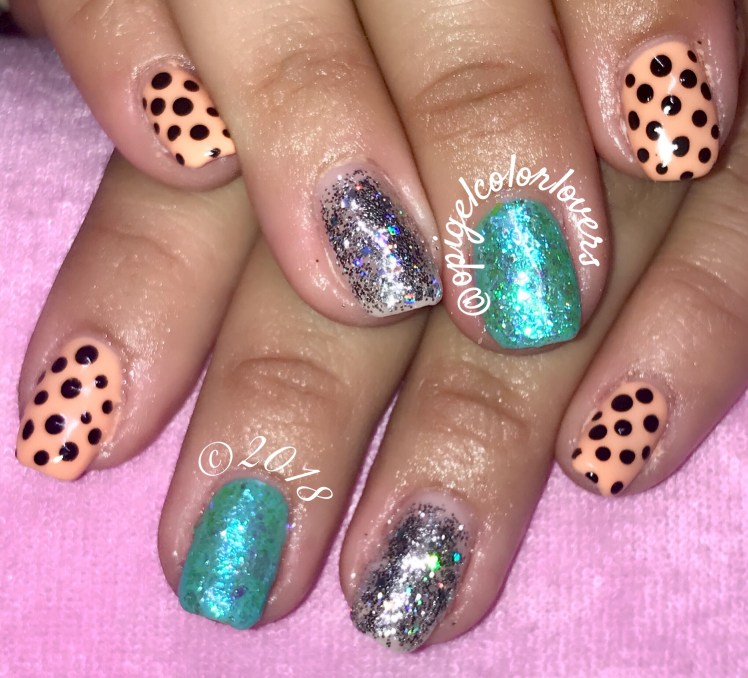Ready to finally warm up? Heres something for you I’m Getting A Tan-Gerine (Retro), I applied 3 coats since its a lighter color – then I used a dotting tool and a black from Vetro to make the dots. the glitter is In True Stefani Fashion (Gwen Stefani Collection), the best method is sponging this one on to get a deeper coverage. Lastly, I used Closer Than You Belem (Lisbon) and covered it with Breeze Flakies from Whatsupnails I just patted them into the tacky layer.