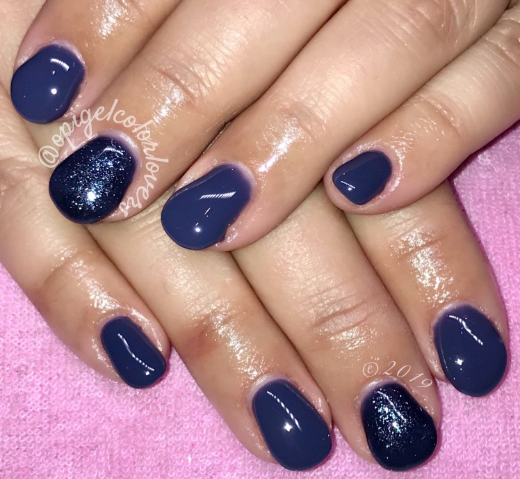 Another holding onto darker colors! Less Is Norse (Iceland) this is a nice cream like purple/blue/gray color hard to describe but it looks awesome! I did talk her into adding Coalmates (Love, OPI XOXO) on one finger just for a little glitter this is only one coat if you can believe it! 🙂 Super easy application of both colors!