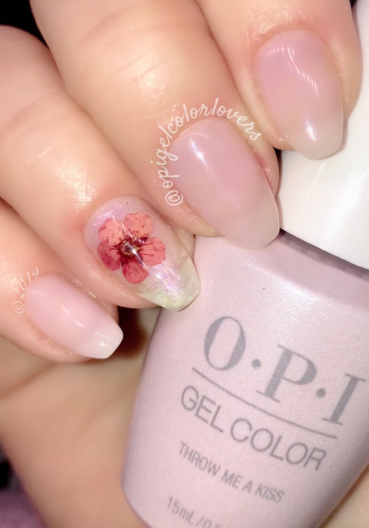 It’s my birthday! So birthday nails! The flower is a dried flower! The ring finger is one coat of Blow Me A Kiss, it’s a clear base with pink shimmer in it. It’s just one thin coat. Then the rest of the nails are Baby, Take A Vow I did use three coats to get a little less sheer.