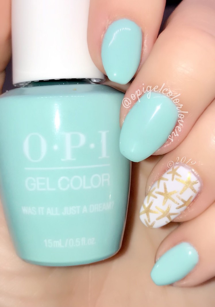Simple yet classy and fun – That’s how this manicure makes me feel. I used Was It All Just A Dream (Grease), this baby blue needed three coats but then was great for coverage. The white nail is Suzi Chases Portu-Geese (Lisbon), I’ve used this color a million times so I won’t go into it again just search for it if you wanna read more. Then to give it a small design I used Born Pretty Plate BP-L017 the starfish design, then I used a gold born pretty stamping polish #1. I love how this turned out, beachy but not over the top.