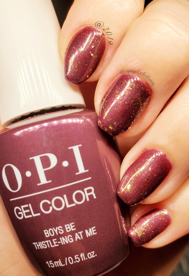 So even though it’s snowing like crazy here it’s still actually fall… I think… haha I have Boys Be Thistle-ing At Me (Scotland) it’s this pretty brown burgundy purple color with some shimmer; I used two coats. I also topped it with Glitter All The Way (Hello Kitty Holiday) this was just a super-thin top coat in order to add more glitter. 🙂