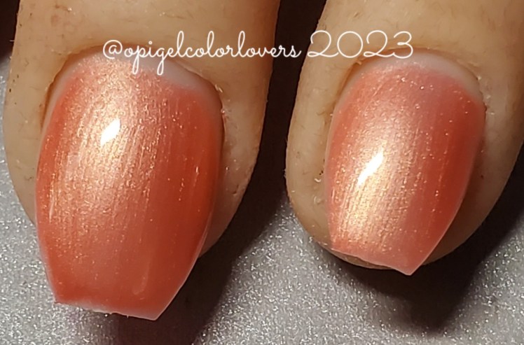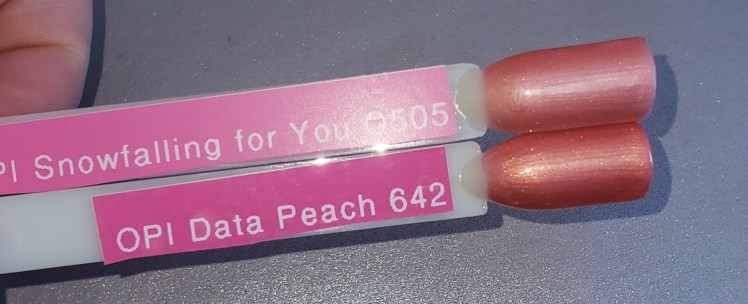 This is a pretty peach pearl shimmer. Like I said before… not my jam. I also needed three coats, and you can easily see brush strokes.