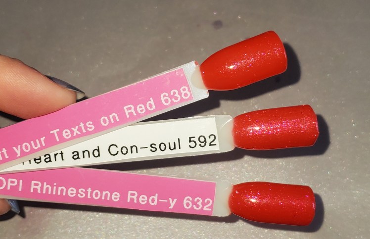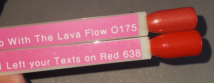 This is a shimmer red-orange; This needed 3 coats, and it reminds me of previous colors…