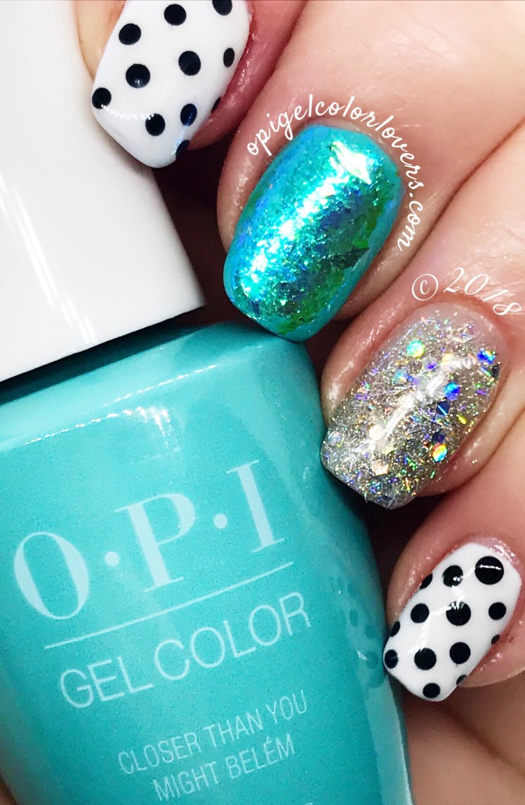 Here’s a super cute manicure. A few colors from the Lisbon Collection: Suzi Chases Portu-Geese – ha I adore the name!! This white is a 2 coater easy! It does lean towards the cool white versus a warmer white. Closer Than You Might Belem is a teal color that also only needed 2 coats; to make this color pop even more I topped it with some Breeze Flakies by WhatsUp Nails, they are super easy to apply and really elevate manicures. Finally, i used Which is Witch? (Oz) this is Holo glitter – circles and “hairs” (as I like to call them) – I used 3 coats to get good coverage and also used a spong to dab it on.