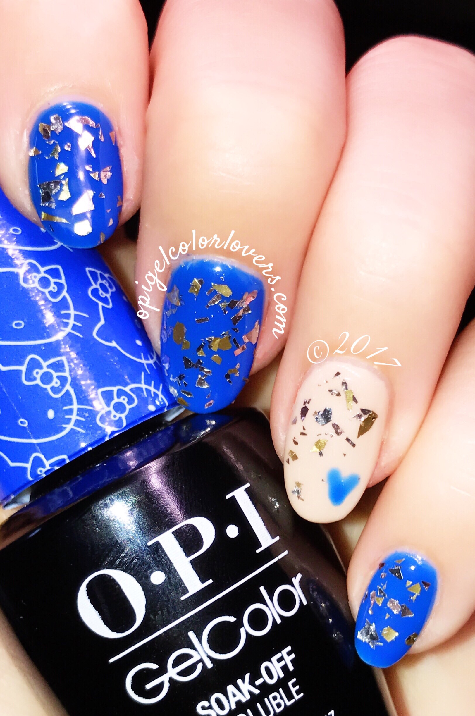So I tried a different mix of colors… I like it… kind of… Anyways I used Pale To The Chief (Washington D.C.), this is a color that reminds of me My Vampire is Buff. It’s a buff nude creme color. I used 3 coats to give it a great coverage. The next color I used was My Black Joey, this is a super bright blue! I love this it’s so bright and happy! I used 3 coats just to get a richer color not because it actually needed it. Okay so for the topper I used an older glitter topper – Gaining Mole-Mentum (Muppets Most Wanted). This topper is so unique it is basically little shards of gold, silver and rose gold foil in a clear base. As you can see it looks like they are just floating on top of the color. I should use this topper more but it tends to be forgotten…